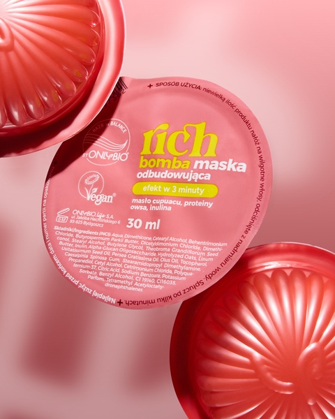 Rich Bomba maska odbudowująca Hair in Balance by OnlyBio stworzona z myślą o włosach zniszczonych i osłabionych. Masło cupuaçu regeneruje i odżywia, proteiny owsa odbudowują strukturę, a inulina chroni przed utratą nawilżenia. Efekt: mocniejsze, bardziej sprężyste włosy o zdrowym wyglądzie.